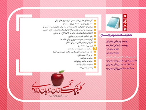 بانک صوت (27 عنوان)، بانک فیلم (بارداری 21 عنوان، برنامهآموزشی 9 عنوان، ناباروری 13 عنوان، 20 عنوان)، پرسشهای متداول (84 عنوان)، مقالات و مجلات (27 عنوان)، کتابخانه (42 عنوان)، دانشنامه بارداری و زایمان (109 عنوان)، دانشنامه بیماریهای زنان (119 عنوان)، دانشنامه عمومی زنان (100 عنوان)، اهمیت سلامت (4عنوان)، مهارتهای زنان (55 عنوان)، معرفی سایت (95عنوان)، معرفی کتاب (47عنوان)، میباشد.