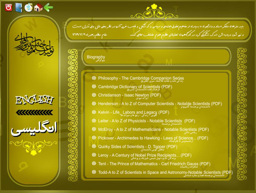 - بخش ششم: بخش انگلیسی (دایرهالمعارف، زندگینامه، علوم طبیعی و انسانی، فلسفه علم و دانش، تاریخچه علم، حقوق و فناوری)