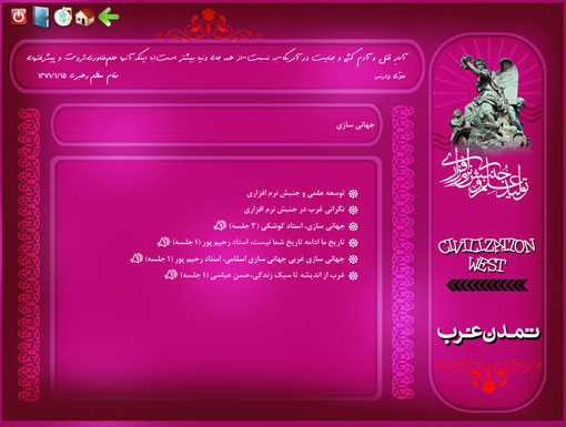 - بخش چهارم: تمدن غرب (نقد تمدن غرب. جهانی سازی:توسعه علمی و جنبش نرمافزاری. مدرنیته: انتقال به مدرنیته. علمزدگی)